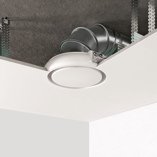 Диффузор монтируется в одной плоскости с гипсокартоном, шпаклюется и красится в цвет потолка.